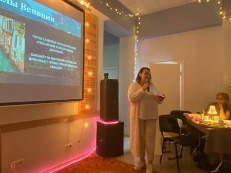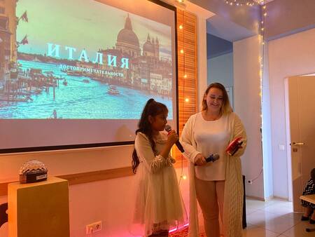 Зал был полон, не хватало мест. Радовало то, что много было молодежи, детей, семей, людей среднего возраста. Италию представляли Ольга и ее дочь Анжелика, которые недавно переехали из Италии в Россию, и пришли на обучение в детский центр развития «Логос». Анжелика спела песню на итальянском, а Ольга провела викторину.