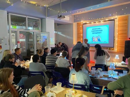 А вечером в субботу атмосферно и динамично прошел праздник, посвященный мамам. Зал семейно-досугового центра был полон – на мероприятие пришли школьники семейной школы «Логос» со своими родителями, члены общины и их знакомые и родственники. Удобно разместившись за столиками, пришедшие участвовали в викторине, мастер-классе по приготовлению здоровой еды, дискуссии на тему: «Современная женщина: кто она?». Ученики выступили перед публикой, и в конце программы на память взрослые получили брошюру со стихами и календари, а дети – детскую христианскую книгу.